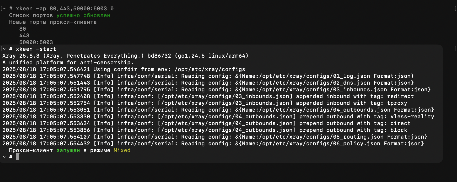 Для снижения нагрузки на процессор также ограничим работу XKeen портами 80, 443 и 50000:50030:
