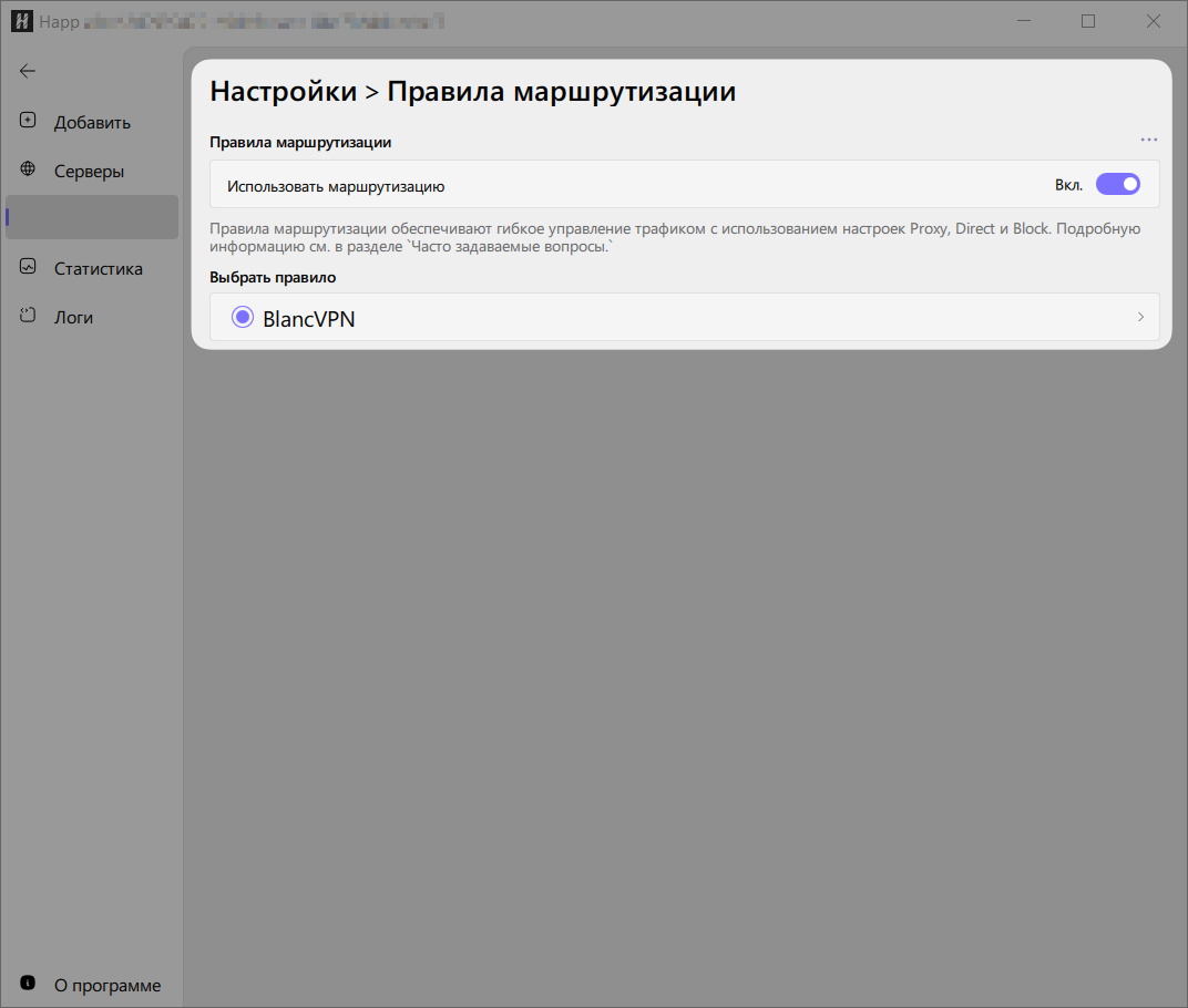 В приложении Happ выберите Настройки → Правила маршрутизации. Появится параметр BlancVPN с маршрутизацией.