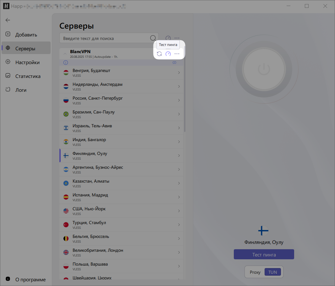 Вы можете проверить серверы по пингу (это информация о примерной скорости отклика сервера). Как правило, чем ближе к вам локация, тем ниже задержка. Для этого нажмите на значок спидометра Тест пинга.